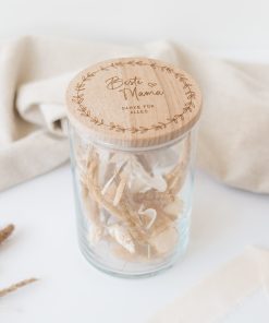 Ihr sucht ein Geschenk für eure Mama zum Muttertag oder Geburtstag und möchtet dieses vor allem mal anders verpacken? Dann ist dieses gravierte Vorratsglas mit Holzdeckel und dem gravierten Spruch “Beste Mama” und einem Kranz genau die richtige Wahl! Die Gläser eignen sich hervorragend zum Verpacken von Köstlichkeiten, Knabbereien oder anderen Kleinigkeiten.