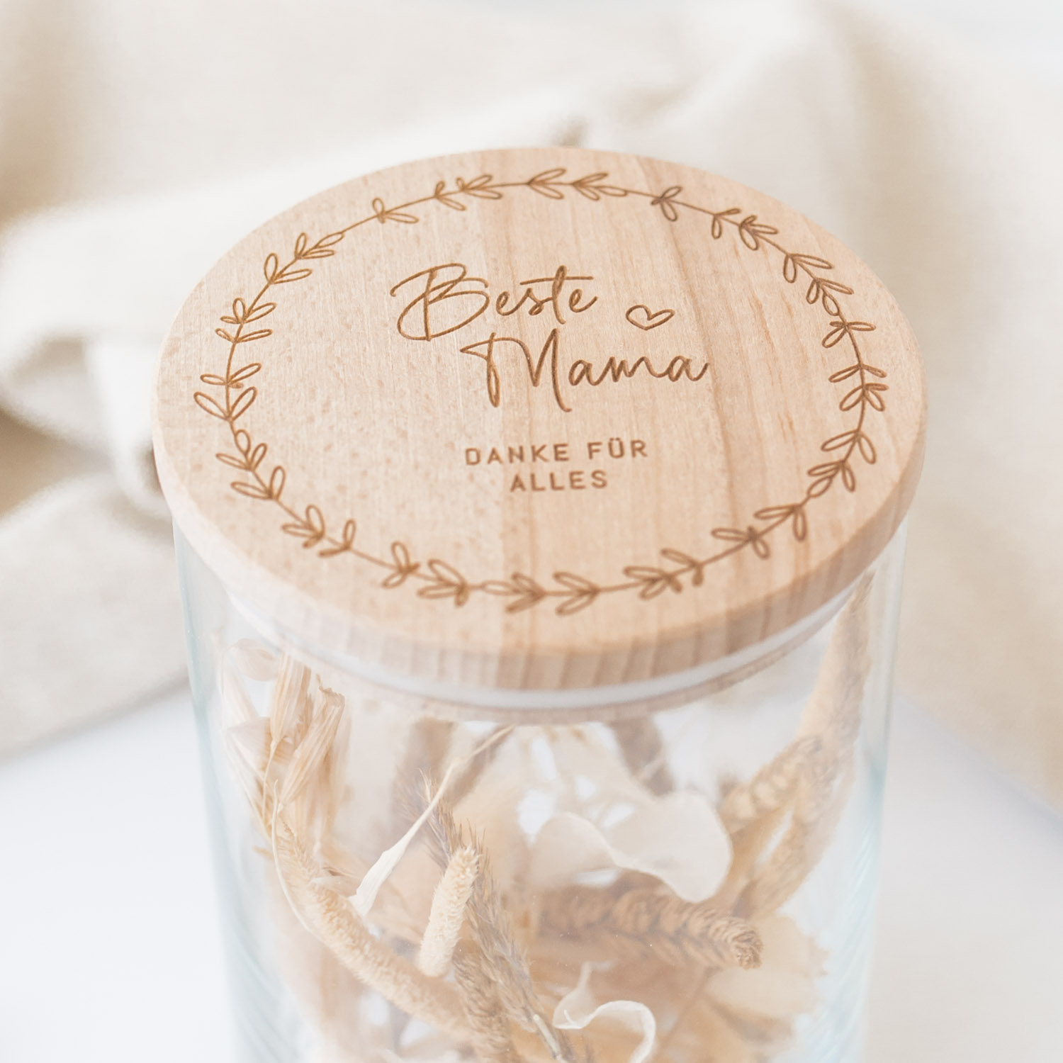 Vorratsglas mit graviertem Deckel | 10 cm Durchmesser | 16 cm oder 20,8 cm Höhe | 880 ml oder 1210 ml | Holzdeckel | Trockenblumen nach Wahl | ohne Dekoration