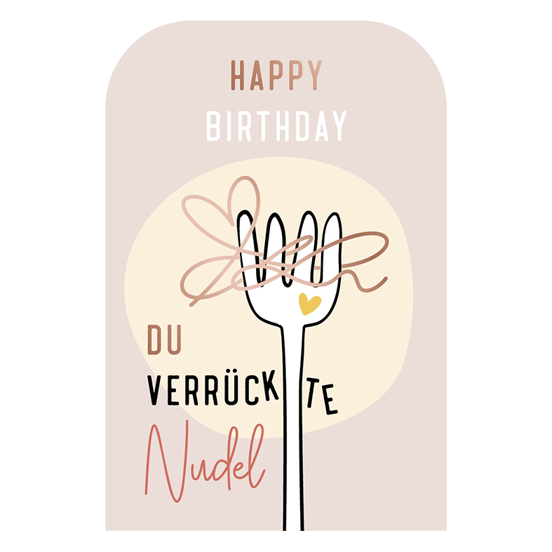 Klappkarte | Doppelkarte mit Kuvert | Text: Happy Birthday! Du verrückte Nudel | 9,9 cm x 14,8 cm | Ausrichtung hoch | Anlässe: Geburtstag | ohne Dekoration