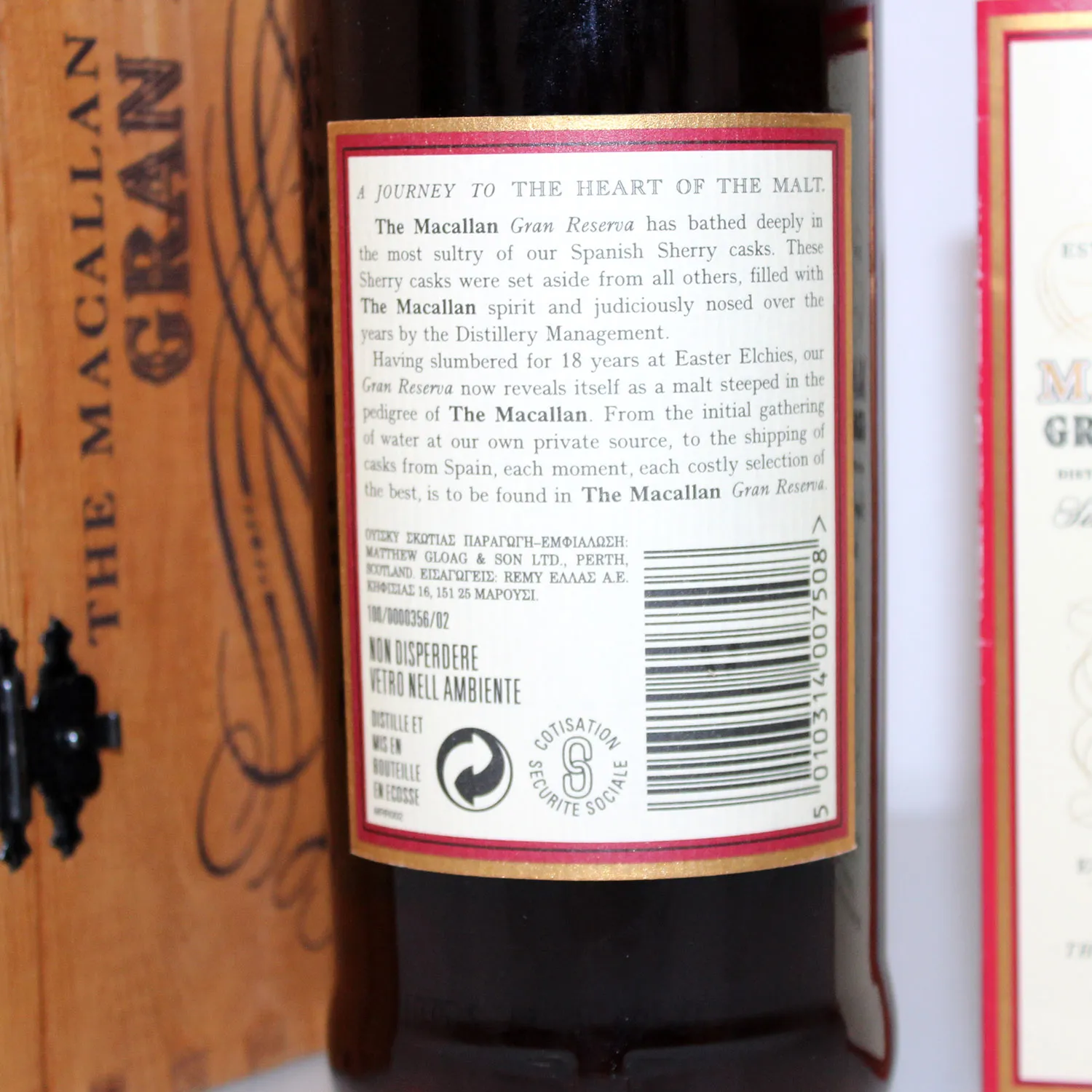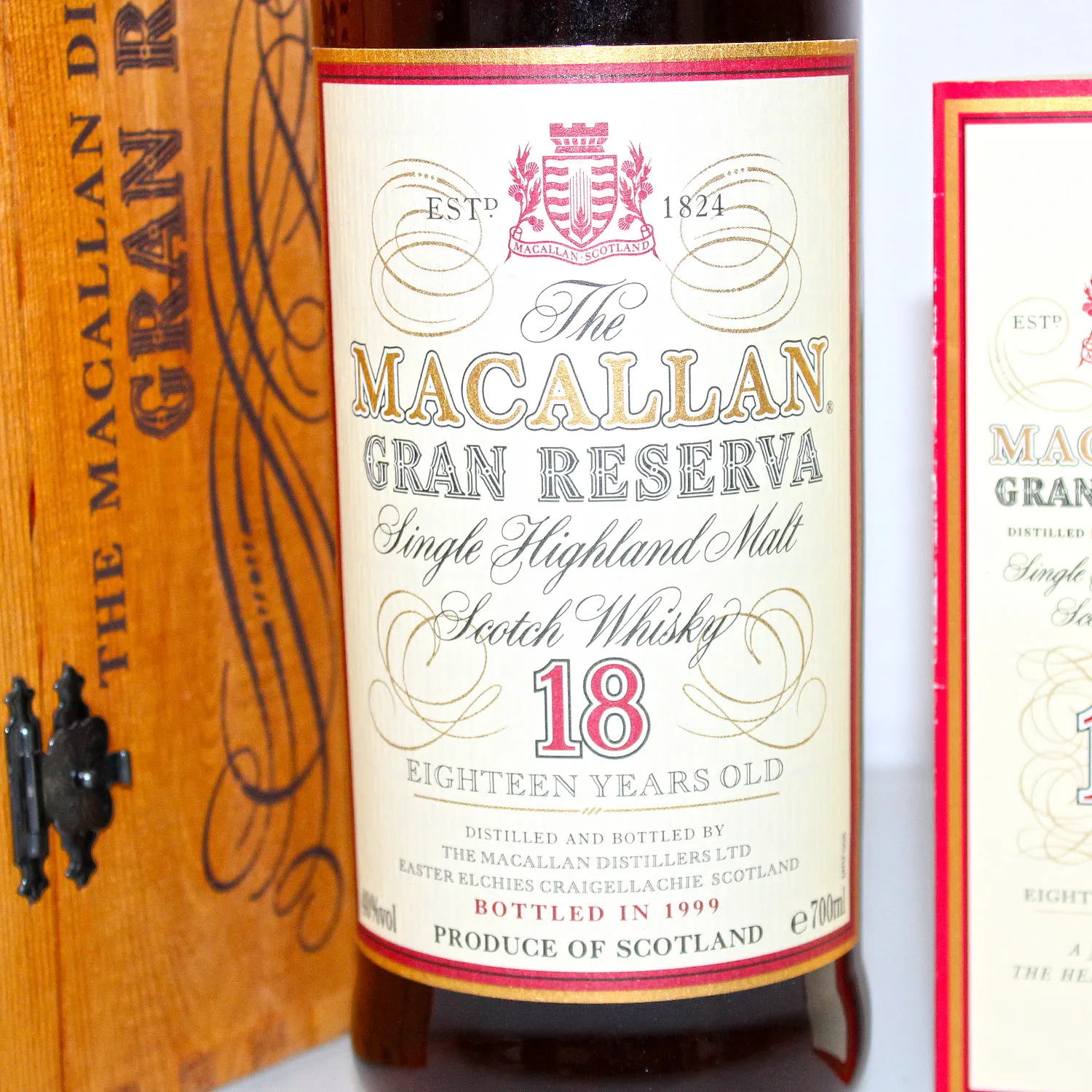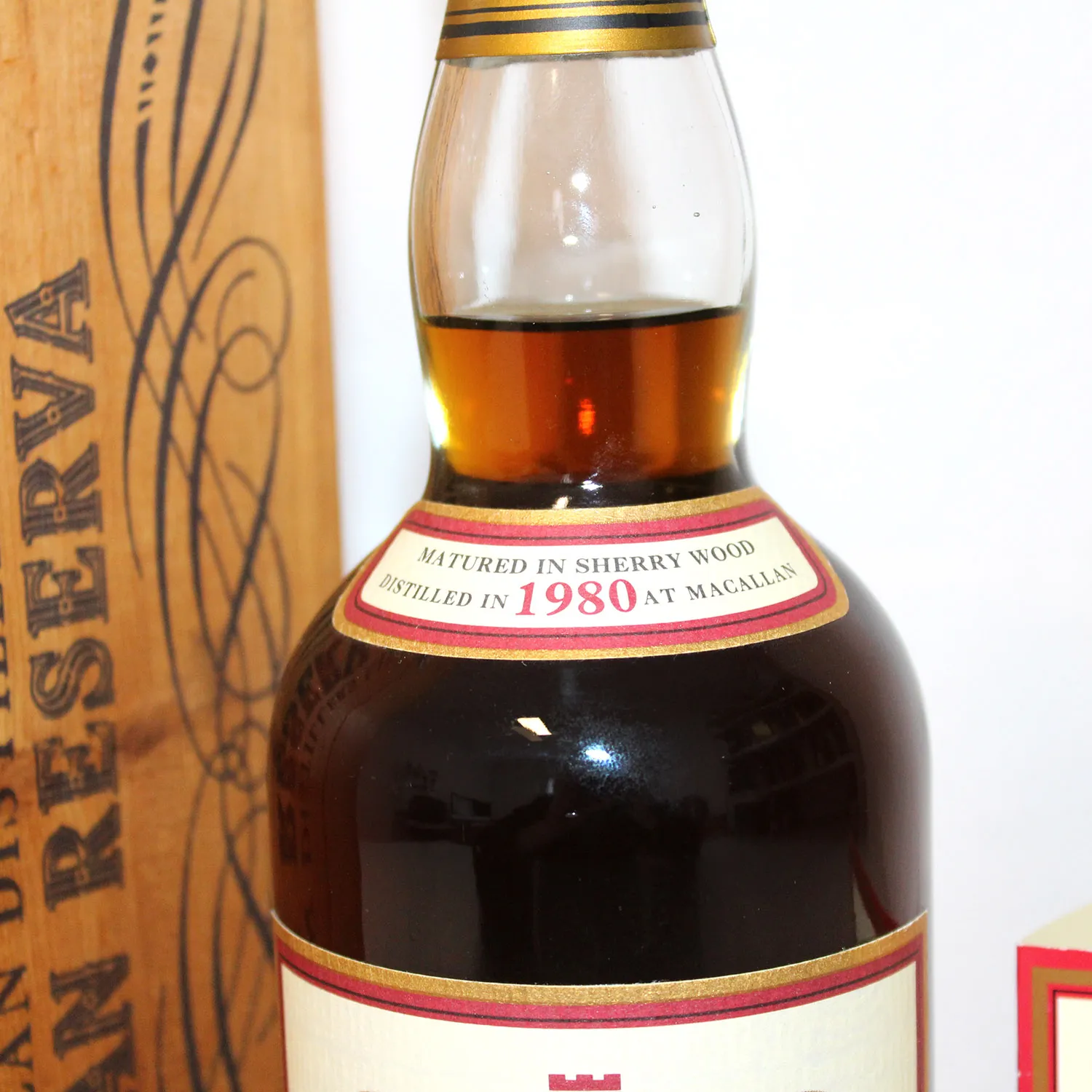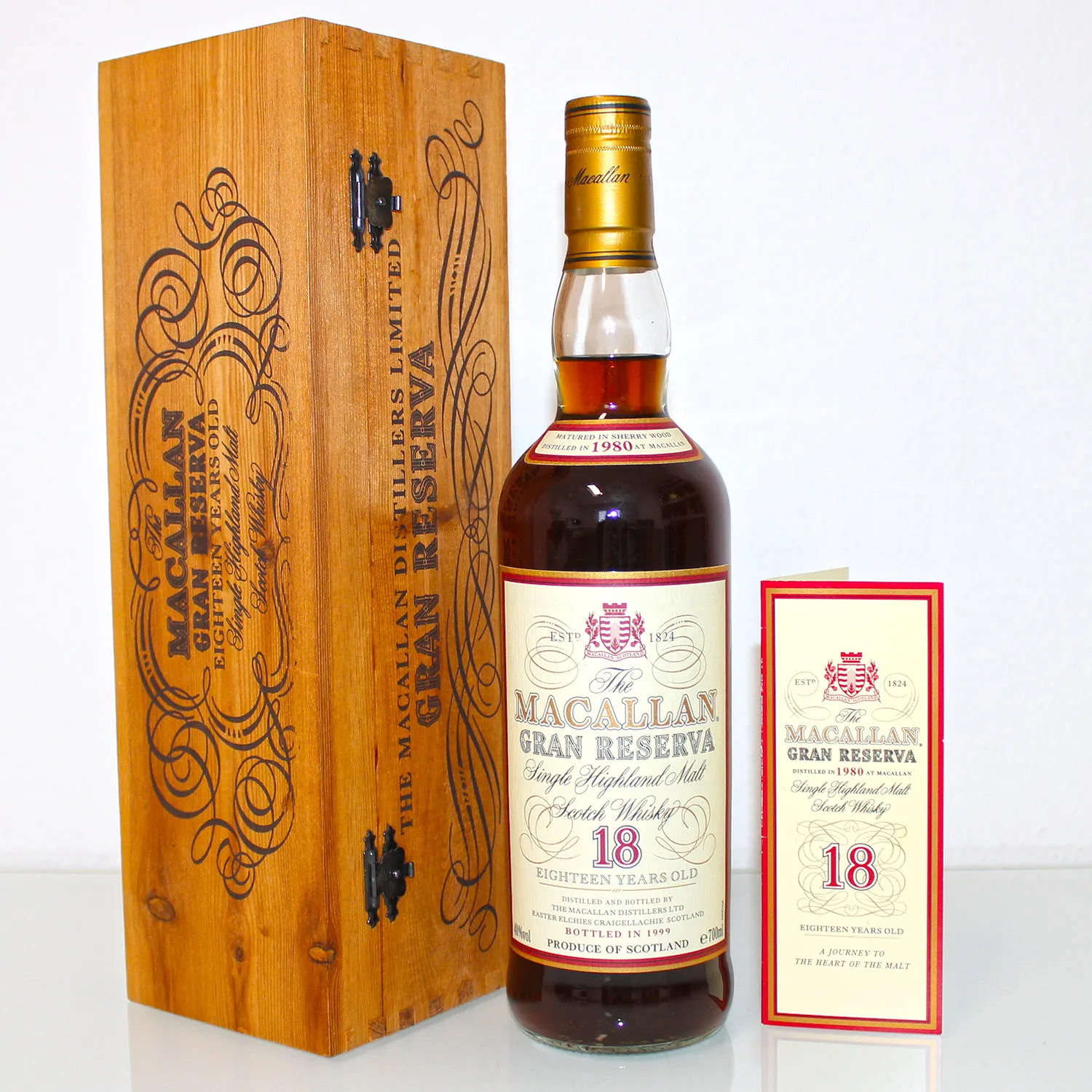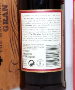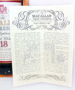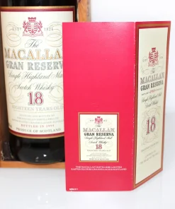 Macallan 1980 18 Years Gran Reserva Single Malt Scotch Whisky, abgefüllt im Jahr 1999 und gereift in Sherryfässern. Er gilt als einer der besten und beliebtesten Gran Reserva Abfüllungen von Macallan.