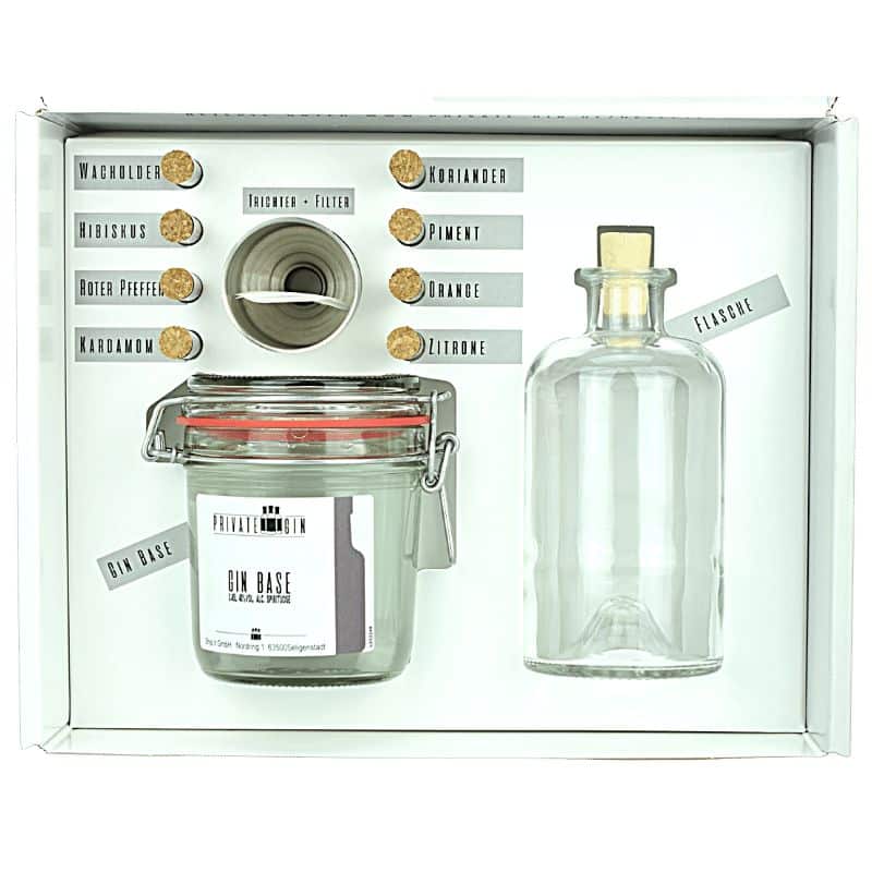 Den Traum vom eigenen Gin hatte sicherlich schon der ein oder andere, Jetzt wird es leicht. Mit diesem Set kommt ein komplettes Paket zu euch nach Hause, mit dem Ihr euch einen eigenen Gin kreieren könnt, vom Destillat über die Botanicals bis hin zur Anleitung und Flasche zum Abfüllen.