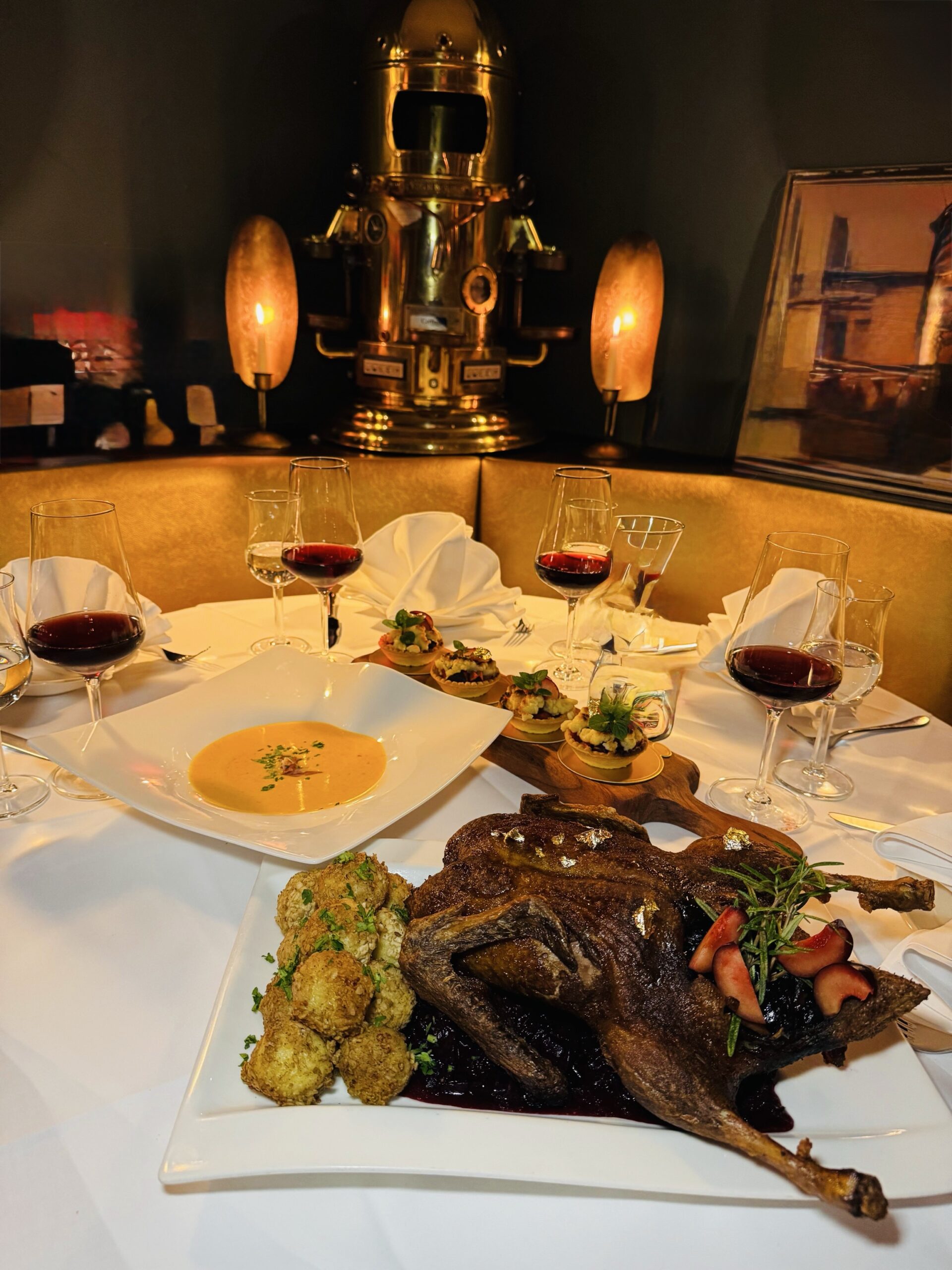 Zart geschmorte Ente, gefüllt mit winterlichem Backobst, serviert mit einer kräftigen, hausgemachten Sauce. Dazu fruchtiger Apfelrotkohl aus der WunderBar-Küche und fluffige, handgedrehte Kartoffelklöße – klassisch, weihnachtlich, köstlich.